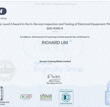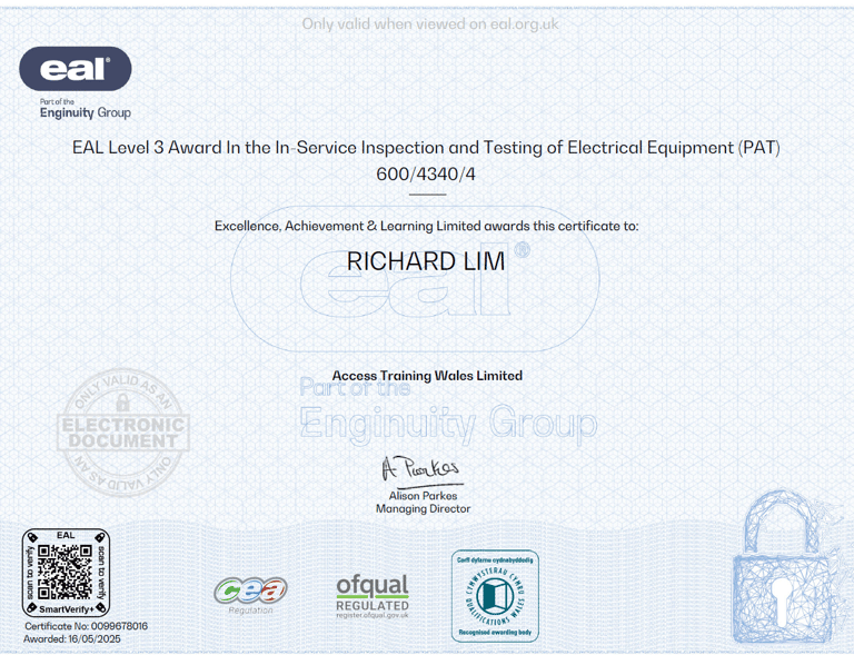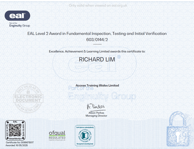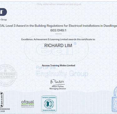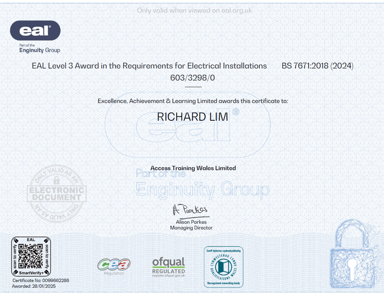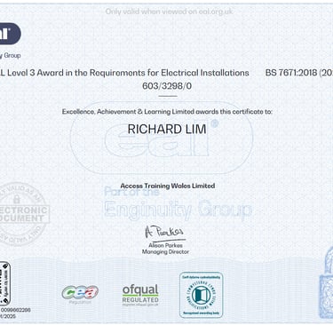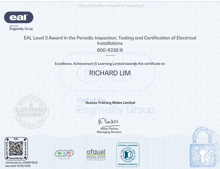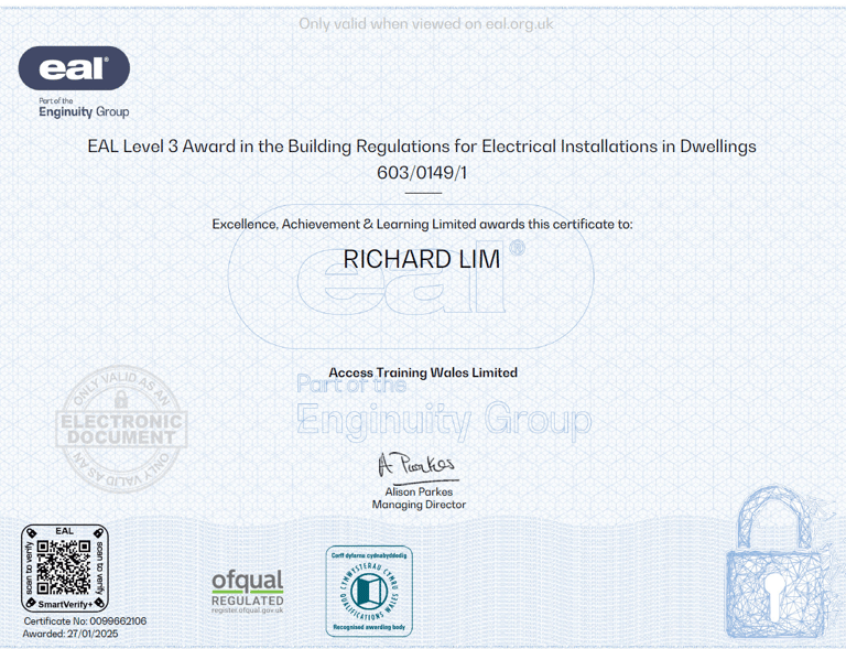 I hold six nationally recognised EAL awards, demonstrating my competence, knowledge, and commitment to delivering safe, high-quality electrical work for your home or business.