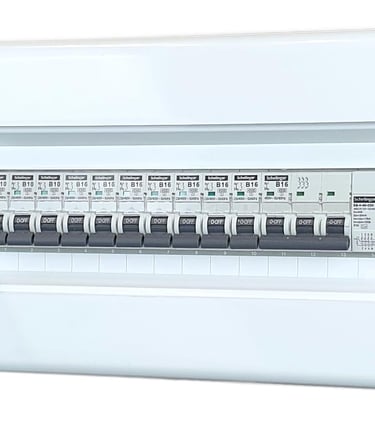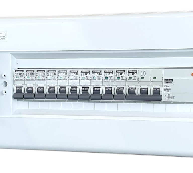A consumer unit is the modern version of the old "fusebox" in UK homes. It’s the small box of switches in your house that keeps the electricity running safely. Every circuit (lights, sockets, kitchen, etc.) has its own switch—usually a Miniature Circuit Breaker (MCB)—and in modern units, you’ll also find Residual-Current Devices (RCDs) that protect against electric shocks and fire risk.